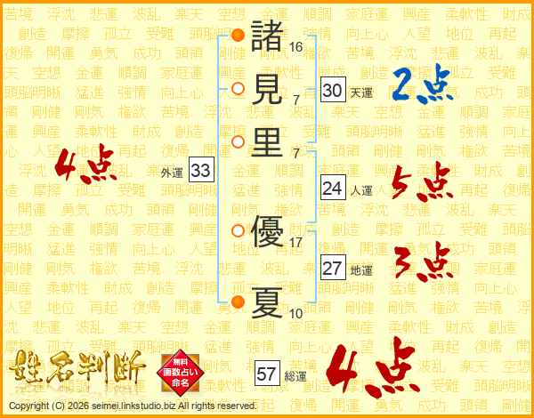 諸(16画)見(7画)里(7画) 優(17画)夏(10画)