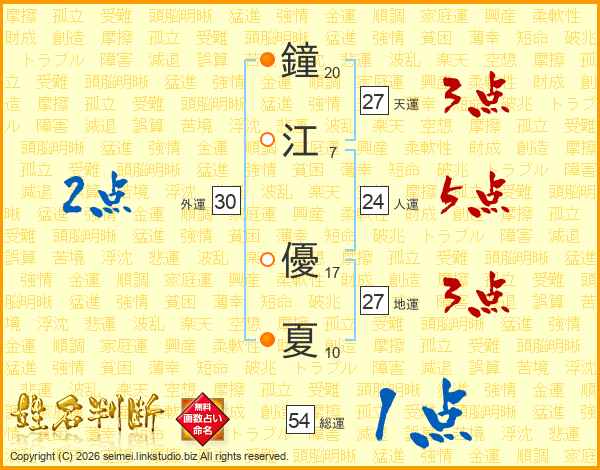 鐘(20画)江(7画) 優(17画)夏(10画)