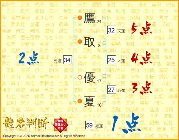 鷹(24画)取(8画) 優(17画)夏(10画)