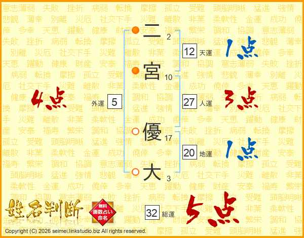 二宮優大さんの総運は32画の5点!