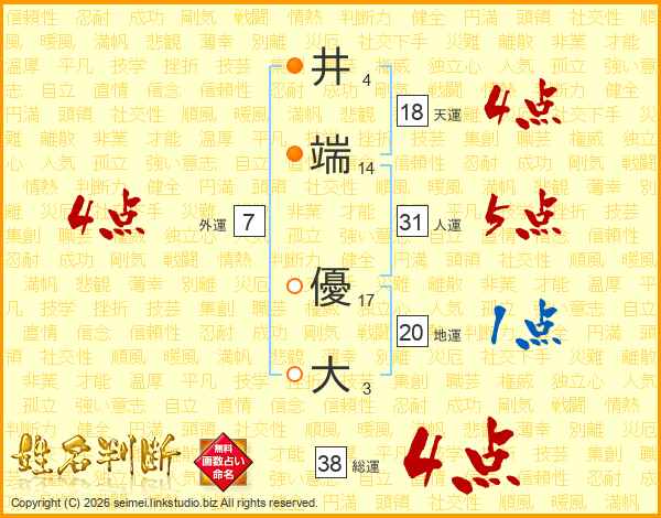 井(4画)端(14画) 優(17画)大(3画)