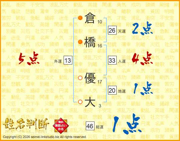 倉橋優大さんの天運は26画の2点!