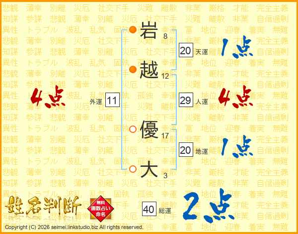 生活面を象徴する運勢です。外部から受ける影響力を表し、結婚運、家庭運や職場、環境への順応性を表します。総運から人運を引いた画数。姓や名が1文字の場合を除く。