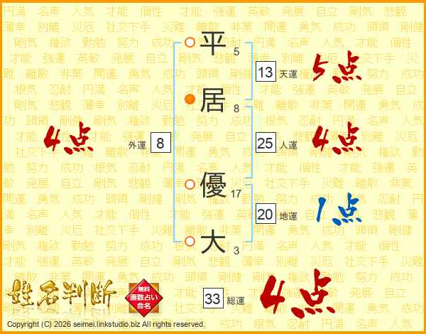 平居優大さんの天運は13画の5点!