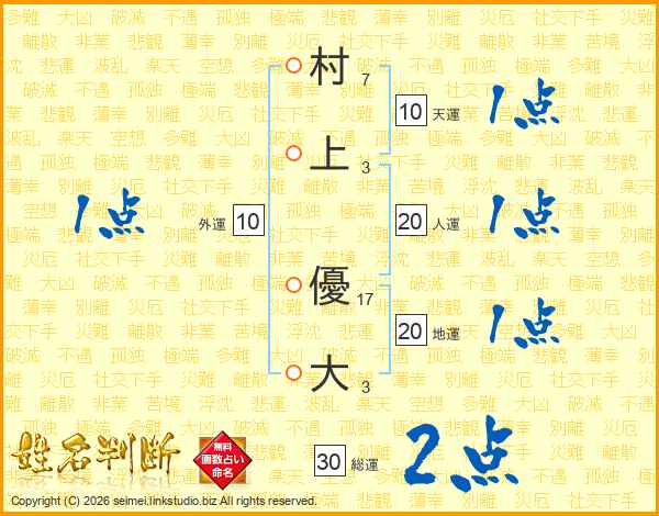 村(7画)上(3画) 優(17画)大(3画)