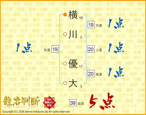 生活面を象徴する運勢です。外部から受ける影響力を表し、結婚運、家庭運や職場、環境への順応性を表します。総運から人運を引いた画数。姓や名が1文字の場合を除く。