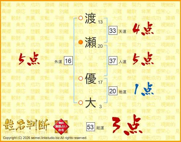 渡(13画)瀬(20画) 優(17画)大(3画)