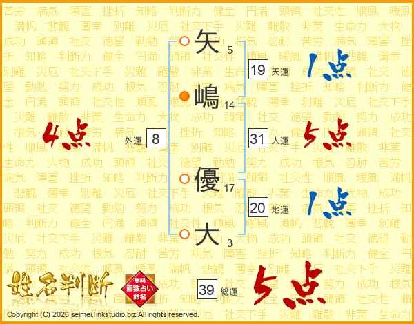矢嶋優大さんの人運は31画の5点!