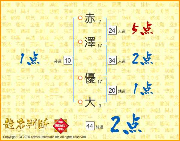 赤(7画)澤(17画) 優(17画)大(3画)