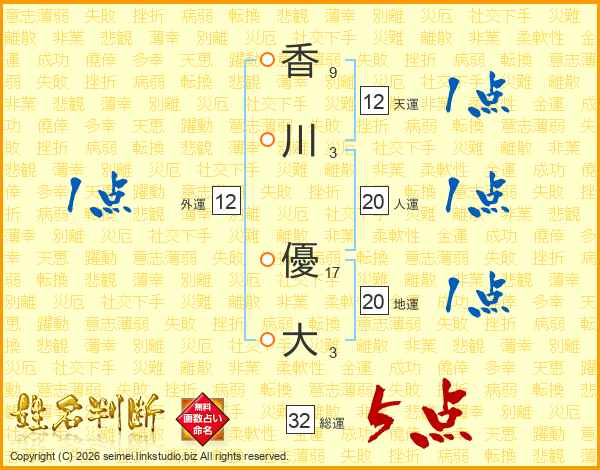 生活面を象徴する運勢です。外部から受ける影響力を表し、結婚運、家庭運や職場、環境への順応性を表します。総運から人運を引いた画数。姓や名が1文字の場合を除く。