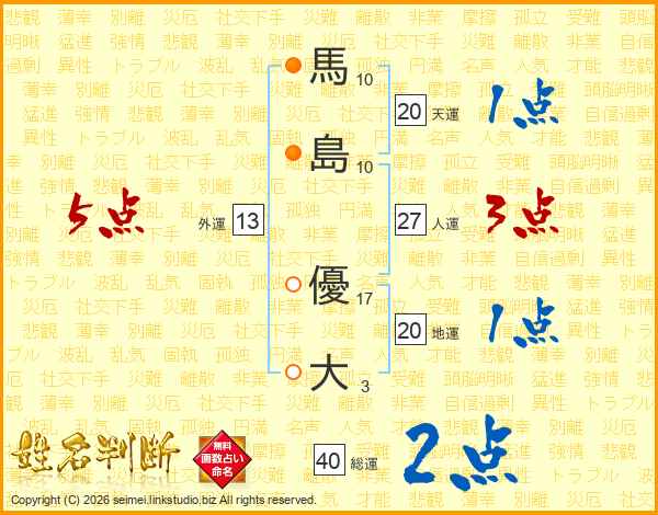 馬(10画)島(10画) 優(17画)大(3画)