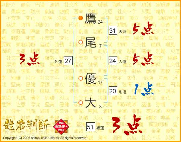 鷹(24画)尾(7画) 優(17画)大(3画)