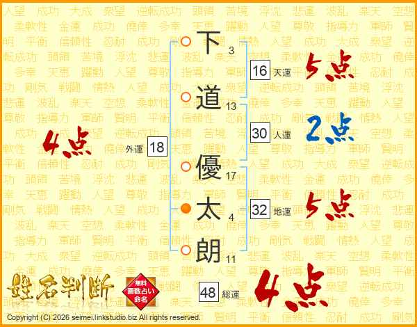 下(3画)道(13画) 優(17画)太(4画)朗(11画)