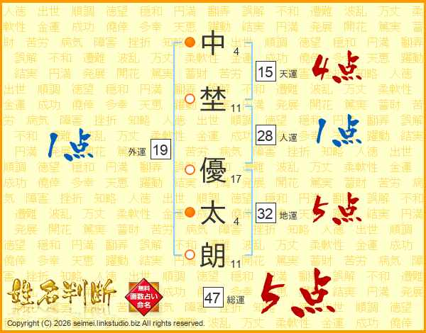 中(4画)埜(11画) 優(17画)太(4画)朗(11画)
