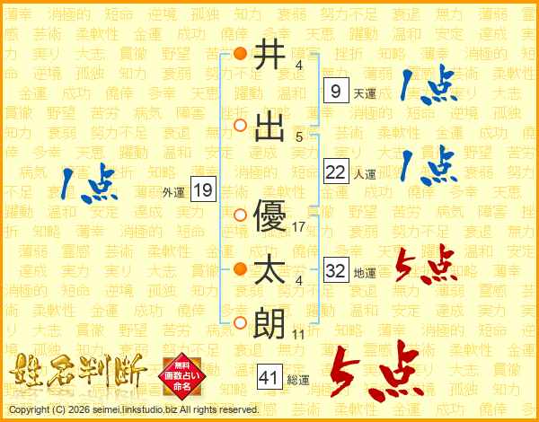 井(4画)出(5画) 優(17画)太(4画)朗(11画)