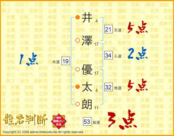 井(4画)澤(17画) 優(17画)太(4画)朗(11画)