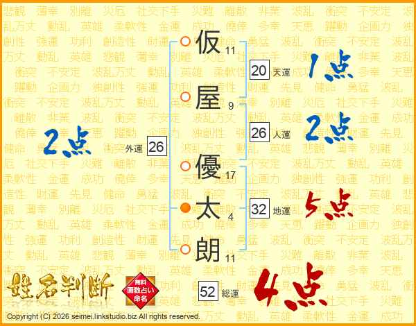仮(11画)屋(9画) 優(17画)太(4画)朗(11画)