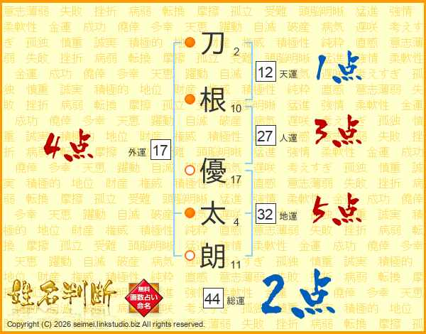 刀(2画)根(10画) 優(17画)太(4画)朗(11画)