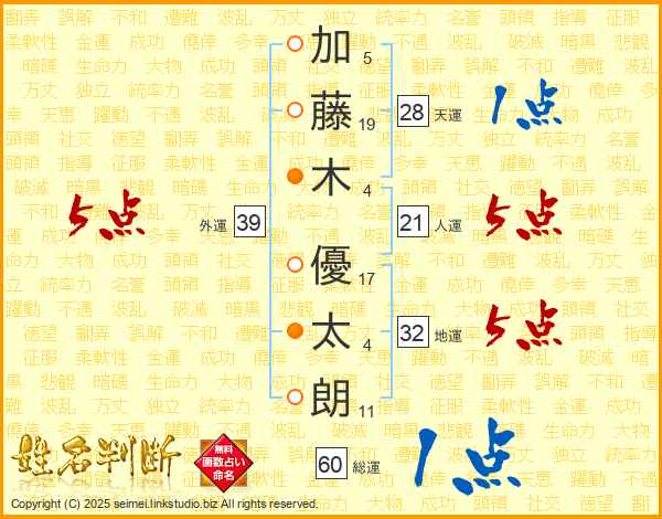 加(5画)藤(19画)木(4画) 優(17画)太(4画)朗(11画)