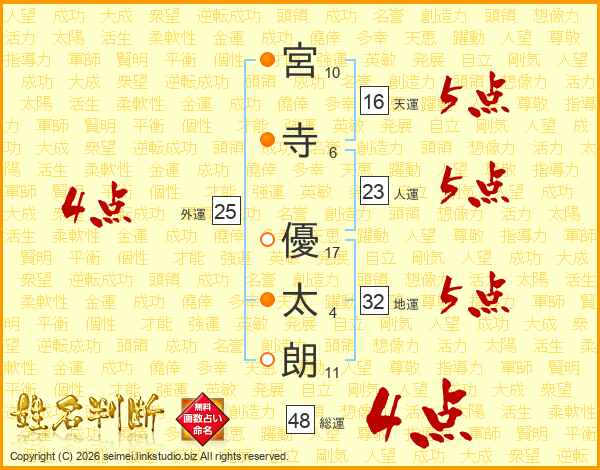 宮(10画)寺(6画) 優(17画)太(4画)朗(11画)