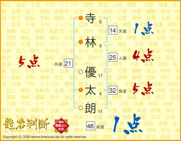 寺(6画)林(8画) 優(17画)太(4画)朗(11画)