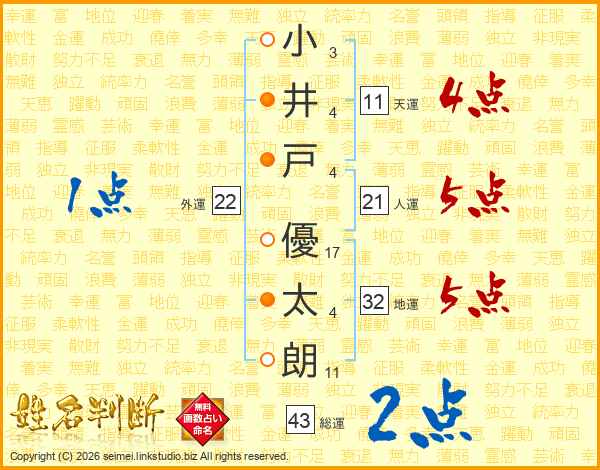 小(3画)井(4画)戸(4画) 優(17画)太(4画)朗(11画)