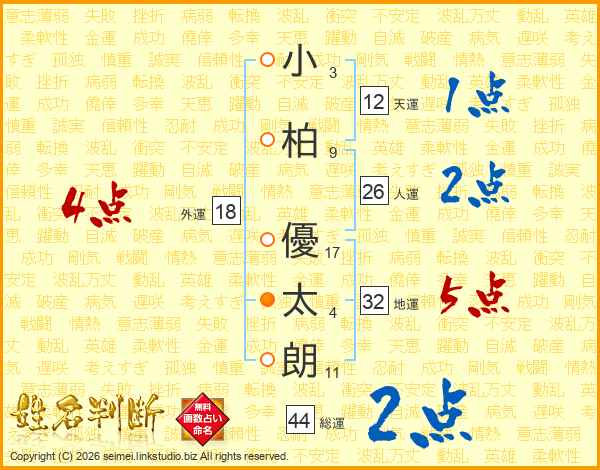 小(3画)柏(9画) 優(17画)太(4画)朗(11画)
