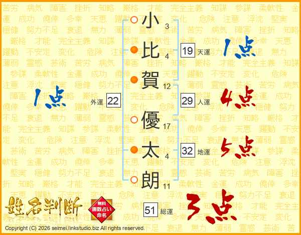 小(3画)比(4画)賀(12画) 優(17画)太(4画)朗(11画)