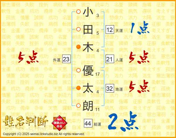 小(3画)田(5画)木(4画) 優(17画)太(4画)朗(11画)
