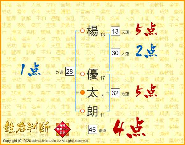 生活面を象徴する運勢です。外部から受ける影響力を表し、結婚運、家庭運や職場、環境への順応性を表します。総運から人運を引いた画数。姓や名が1文字の場合を除く。
