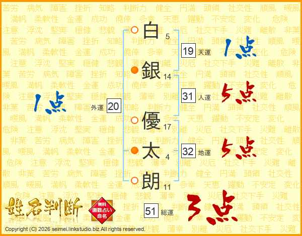 白(5画)銀(14画) 優(17画)太(4画)朗(11画)
