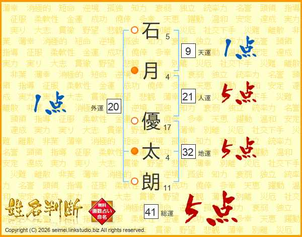 石(5画)月(4画) 優(17画)太(4画)朗(11画)