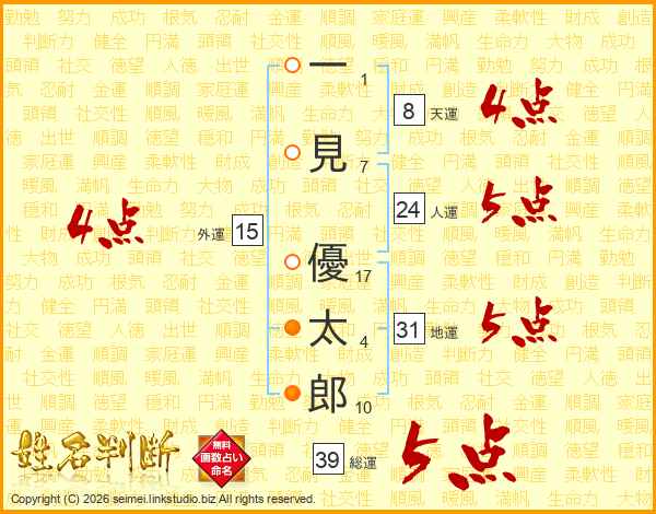 一見優太郎さんの総運は39画の5点!