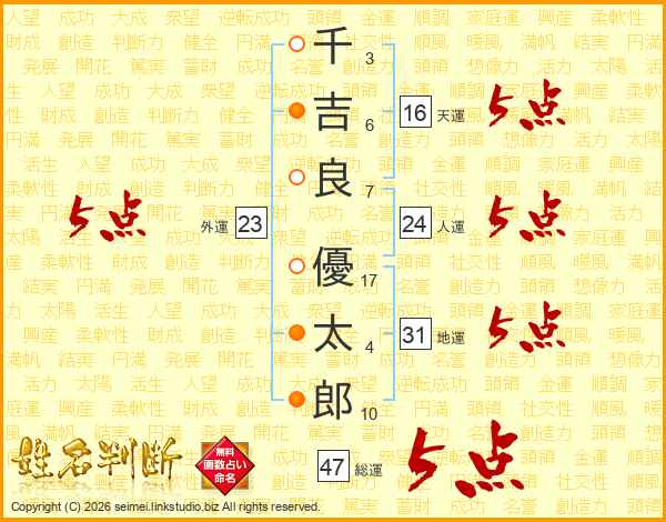 千(3画)吉(6画)良(7画) 優(17画)太(4画)郎(10画)
