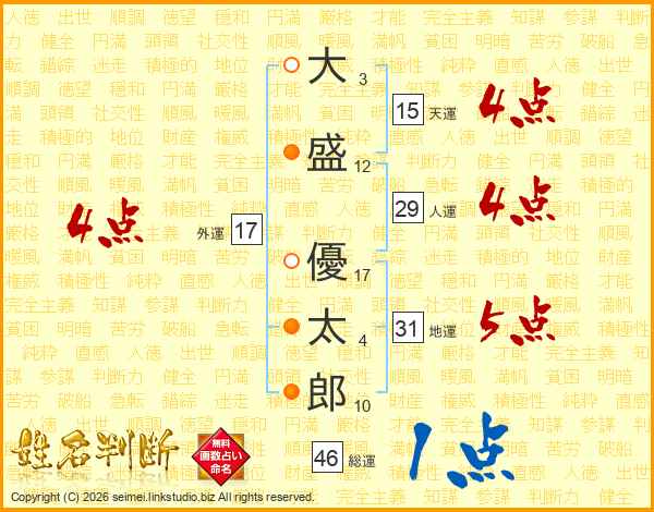 大(3画)盛(12画) 優(17画)太(4画)郎(10画)