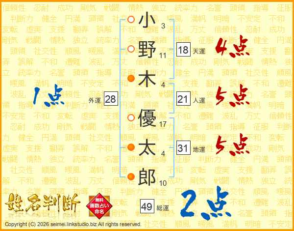 小(3画)野(11画)木(4画) 優(17画)太(4画)郎(10画)