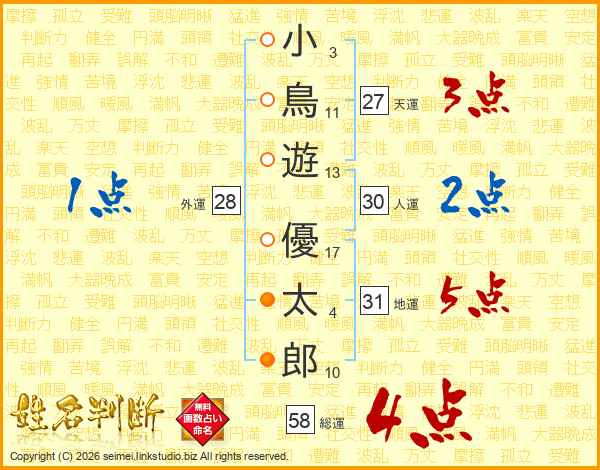 小鳥遊優太郎さんの総運は58画の4点!