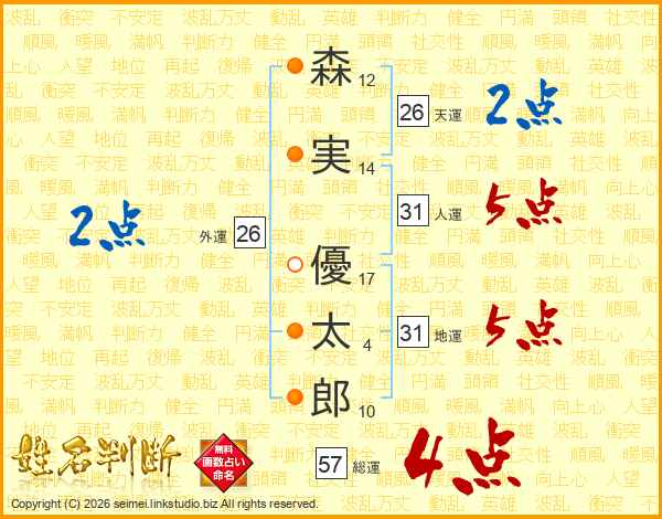 森(12画)実(14画) 優(17画)太(4画)郎(10画)