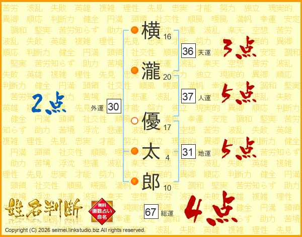 横(16画)瀧(20画) 優(17画)太(4画)郎(10画)