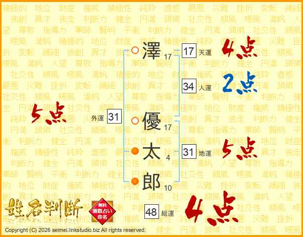 あなたの人生を表す1番重要な運勢です。生涯を通じて影響する総合運となり、主に50歳以降の晩年期に影響を及ぼします。苗字と名前の合計画数。