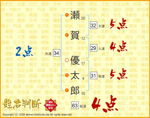 瀬賀優太郎さんの総運は63画の4点!