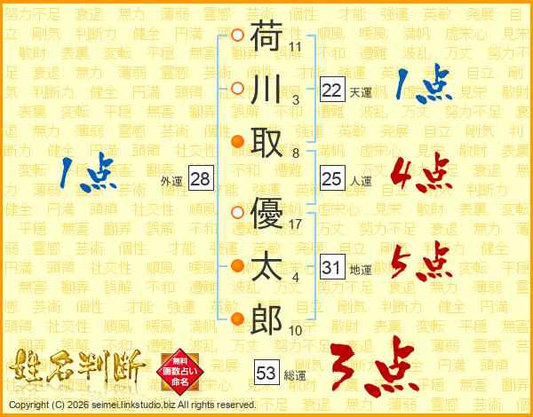 荷(11画)川(3画)取(8画) 優(17画)太(4画)郎(10画)
