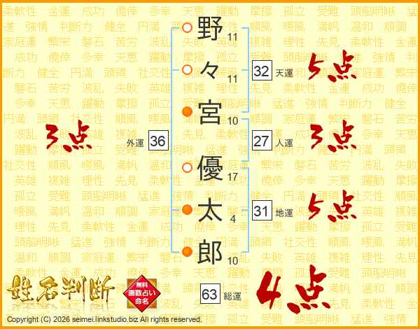 野(11画)々(11画)宮(10画) 優(17画)太(4画)郎(10画)