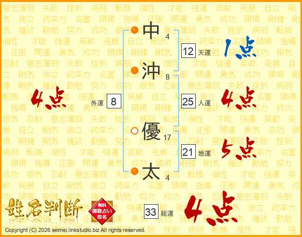 生活面を象徴する運勢です。外部から受ける影響力を表し、結婚運、家庭運や職場、環境への順応性を表します。総運から人運を引いた画数。姓や名が1文字の場合を除く。