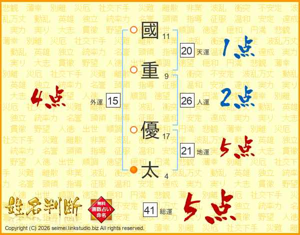 あなたの人生を表す1番重要な運勢です。生涯を通じて影響する総合運となり、主に50歳以降の晩年期に影響を及ぼします。苗字と名前の合計画数。