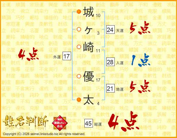 城(10画)ヶ(3画)崎(11画) 優(17画)太(4画)
