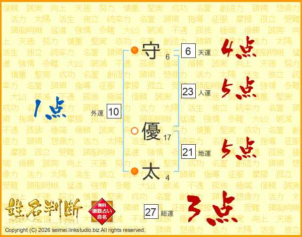 守(6画) 優(17画)太(4画)