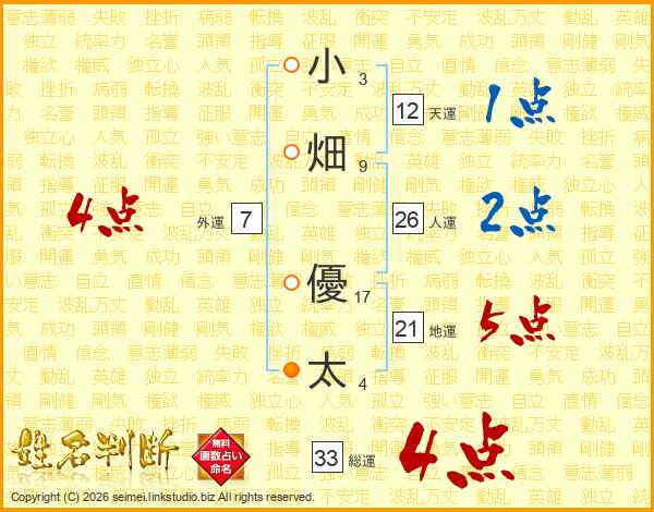 小畑優太さんの総運は33画の4点!