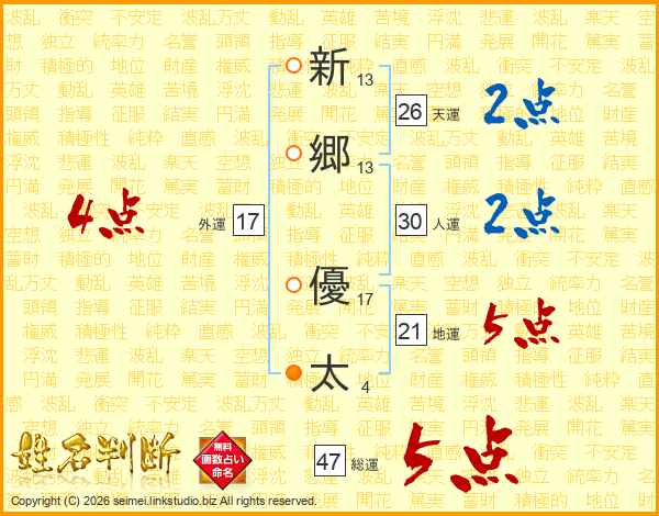 生活面を象徴する運勢です。外部から受ける影響力を表し、結婚運、家庭運や職場、環境への順応性を表します。総運から人運を引いた画数。姓や名が1文字の場合を除く。