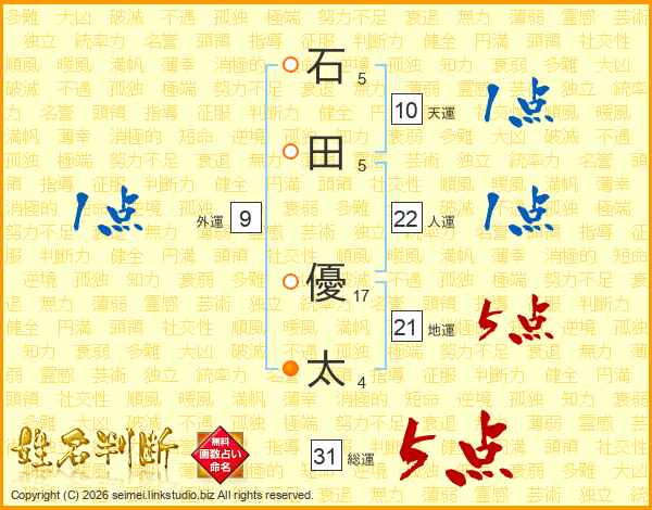 石(5画)田(5画) 優(17画)太(4画)